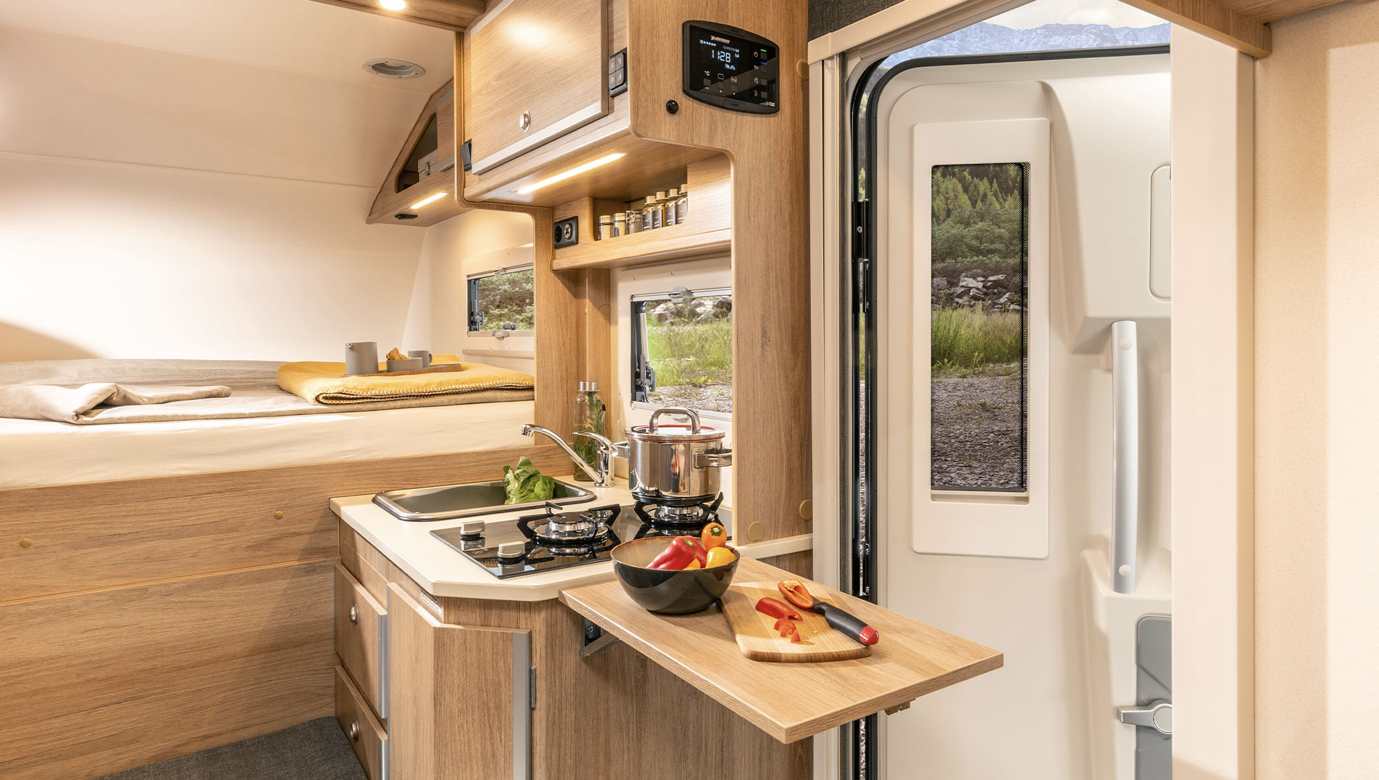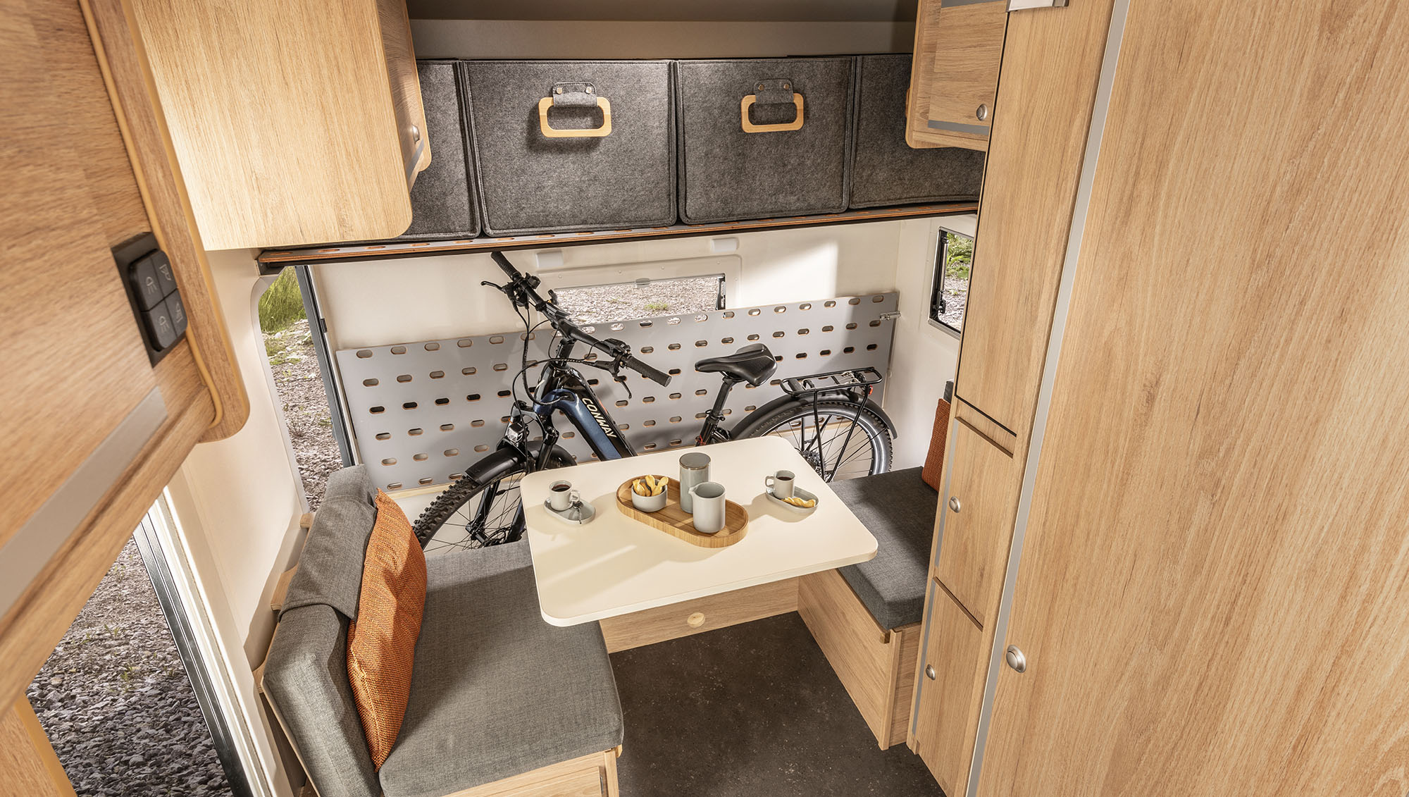 - Im hinteren Teil der Kabine kann eine multifunktionale Heck-Sitzgruppe eingebaut werden. Ihre Sitzfläche an der Kabinenrückwand ist hochklappbar. Durch diese Funktion lässt sich in diesem Bereich Raum schaffen für die geschützte Mitnahme von Fahrrad, E-Bike, Roller, Kite, Kajak, Golf-Bag oder was man sonst noch im Urlaub braucht. Natürlich kann hier auch ein zusammenklappbarer Kinderwagen oder Buggy transportiert werden. Wer den Raum lieber für zusätzliche Stauraumboxen oder ein Slide-out für die Außenküche nutzen möchte, hat auch diese Option.