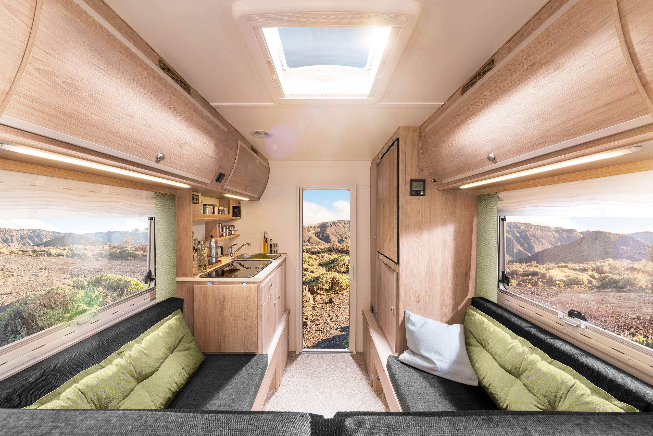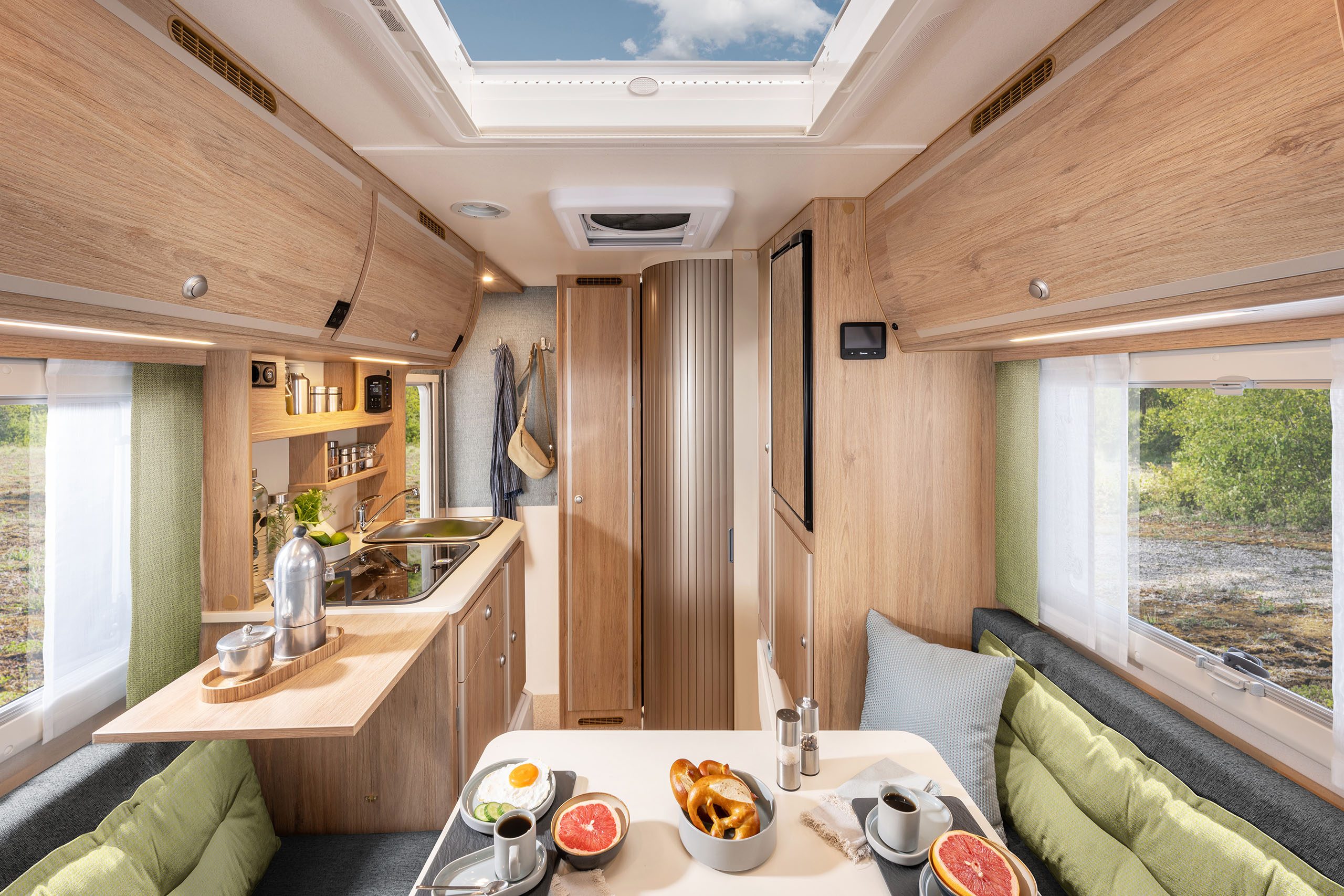 Im Inneren fallen zahlreiche Komfortmerkmale auf: Eine angenehme Stehhöhe von 1,95 m, eine zur Liegefläche umbaubare Mittelsitzgruppe und großzügige Bettenmaße im Alkoven lassen keine Enge aufkommen. Moderne Polsterstoffe und Vorhänge sorgen zudem für eine angenehme Wohnatmosphäre – auch auf langen Reisen.