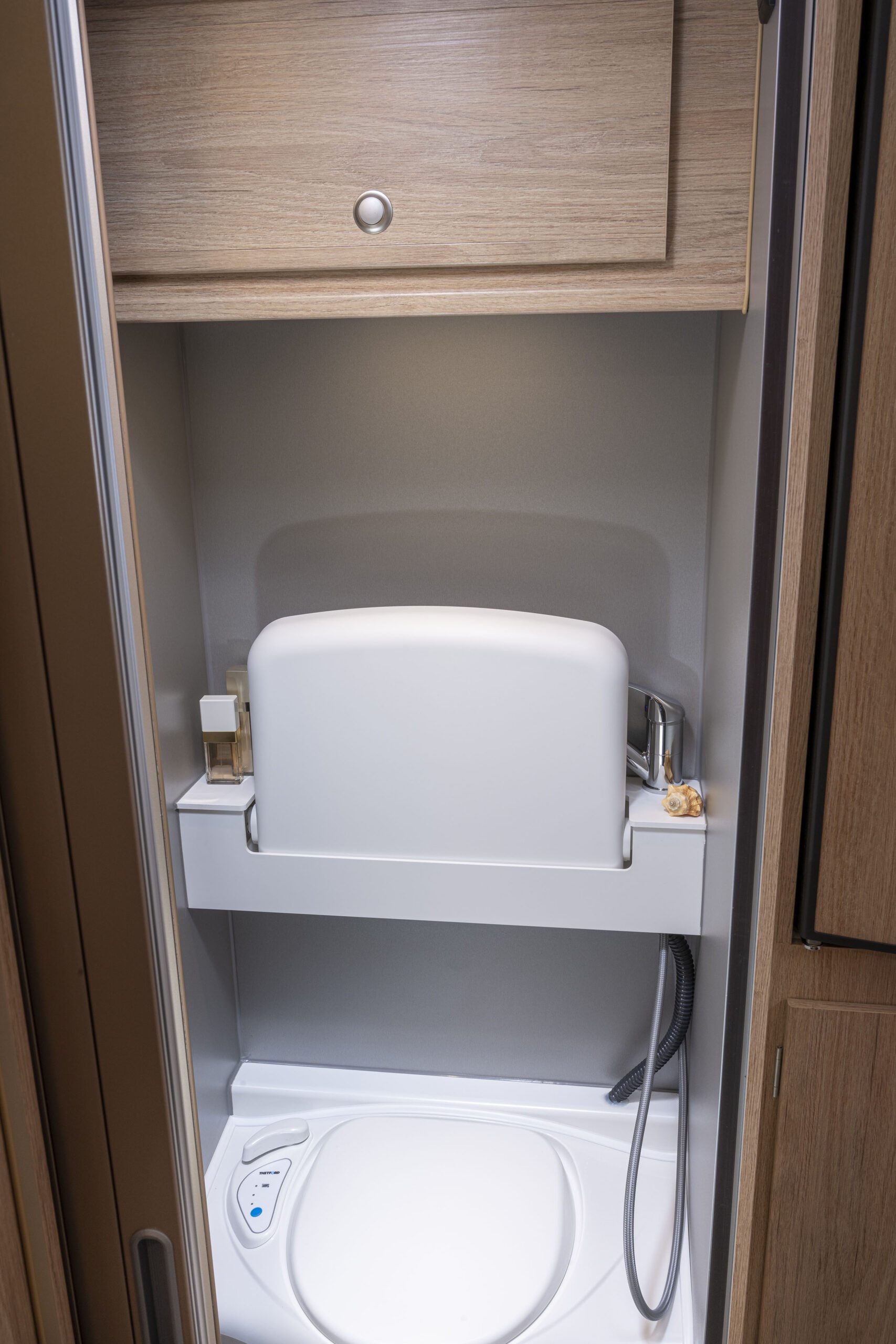 Ein Waschraum mit großem, klappbarem Waschbecken ist ebenso an Bord wie eine Warmwasseranlage. Der Waschraum verfügt über eine Banktoilette und sorgt so für eine klar gegliederte Aufteilung ohne Ecken und Kanten. Pluspunkt: leichte Reinigung garantiert.