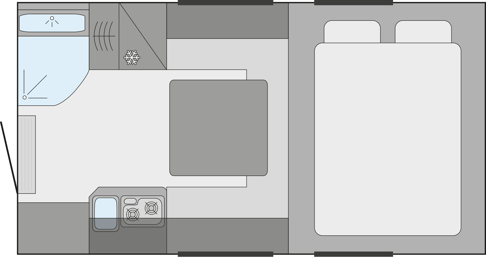 Auffälligster Unterschied ist die Stehhöhe von 2,14 m, die durch die Anpassung an die höhere Fahrerkabine des Defenders bedingt ist. Dadurch wirkt der ohnehin schon großzügige Innenraum noch luftiger. Zudem verfügt die Kabine über einige zusätzliche Stauräume. Der Waschraum besitzt, wie alle unsere Kabinen, das neue, moderne Wanddekor. Die dunklere Farbgebung sorgt für einen schönen Kontrast zu den weißen Sanitäranlagen.