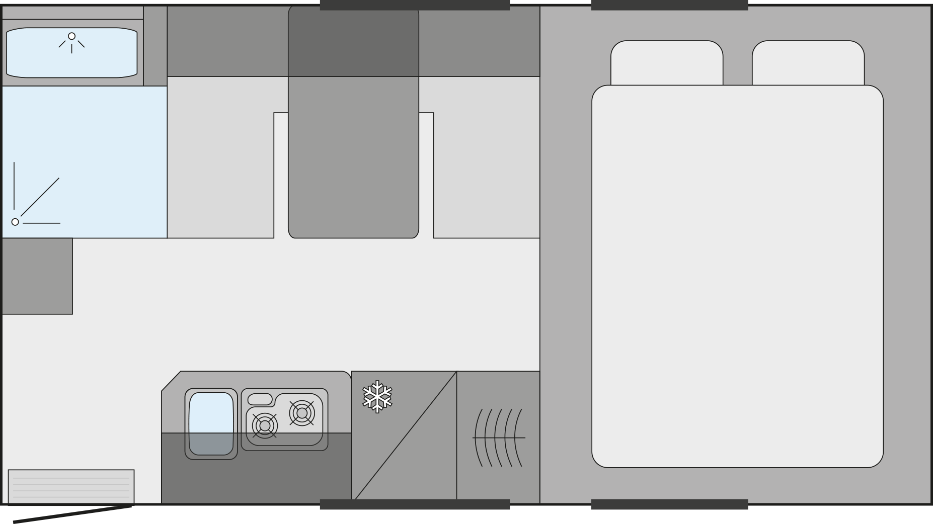 Die Absetzkabine Trail/Box 260SD ist das optimale Domizil für ausgedehnte und entspannte Reisen zu zweit.